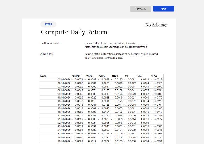 Part 2 can be more interesting to read for people with certain level of financial knowledge or people come from a mathematical, computer science or engineering background, it is perfectly okay if you want to skip these. It mainly explains the certain choices of approach in the worksheet, such one specific return calculation is used instead of another.